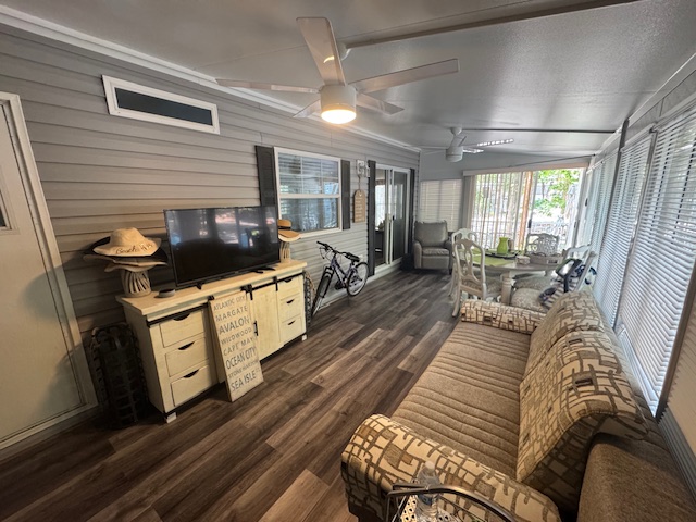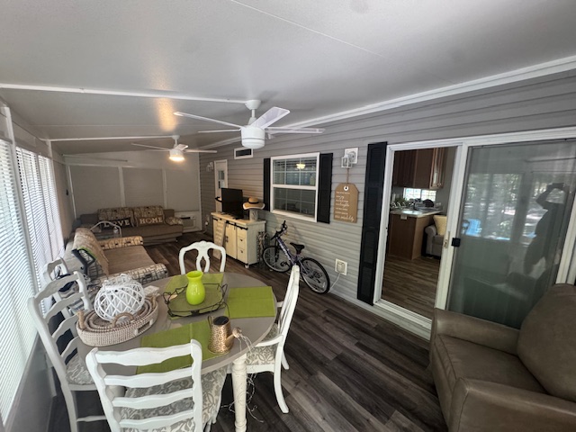 Large, fully enclosed Florida room with ceiling fans, multiple sitting areas, dining space, and plenty of windows for natural light