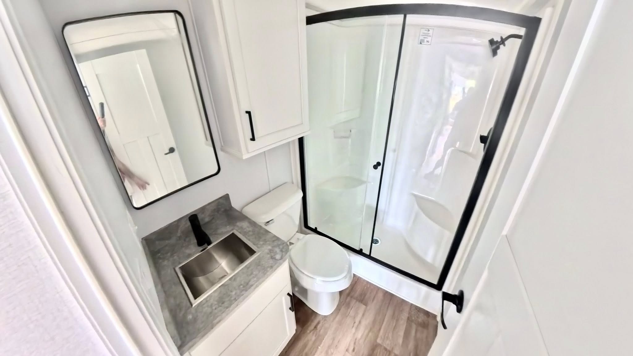 • Bathroom with full-size shower with glass doors, vanity, sink, & residential-style toilet
