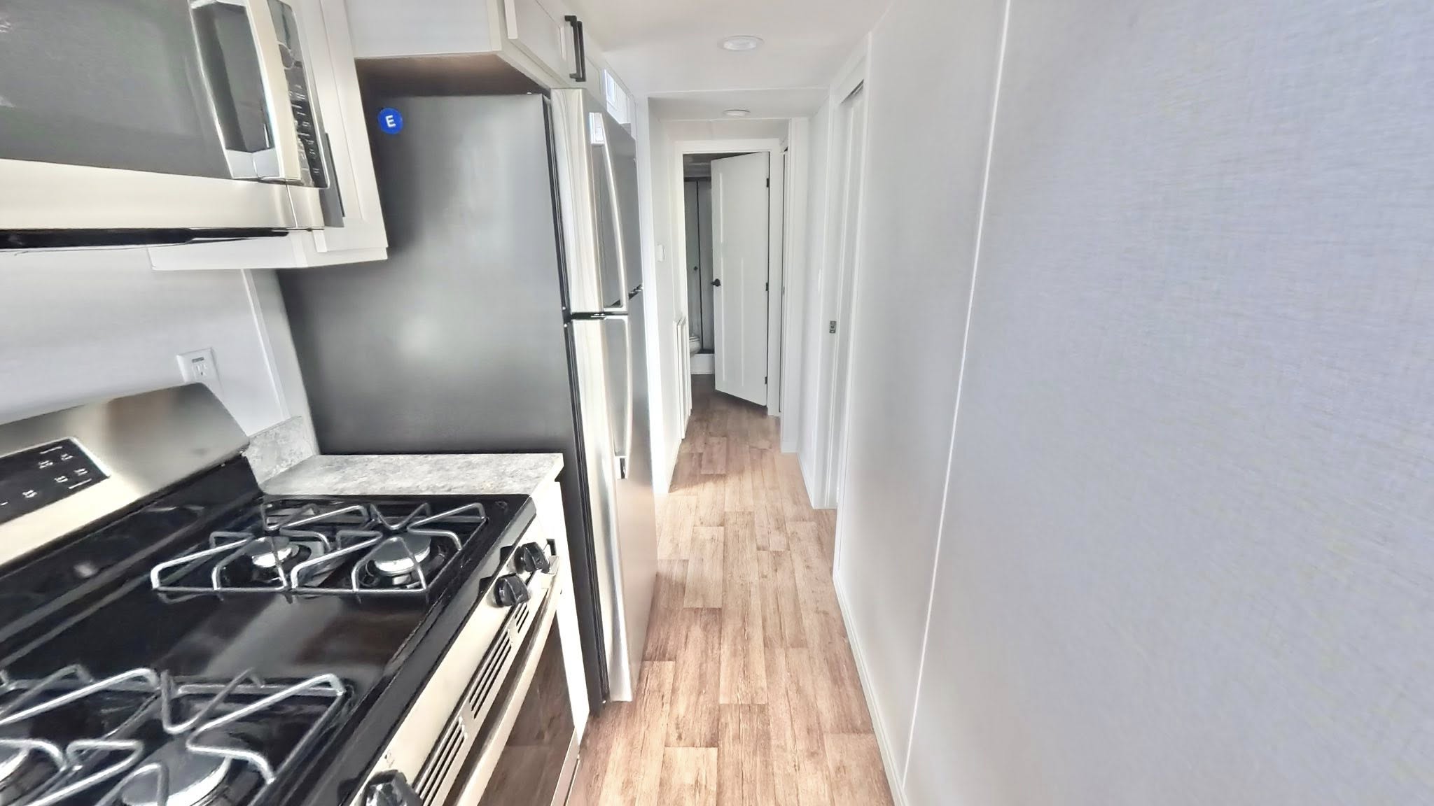 • Modern kitchen featuring full-size stainless steel appliances (stove, oven, microwave, refrigerator), farmhouse sink, & cabinet space