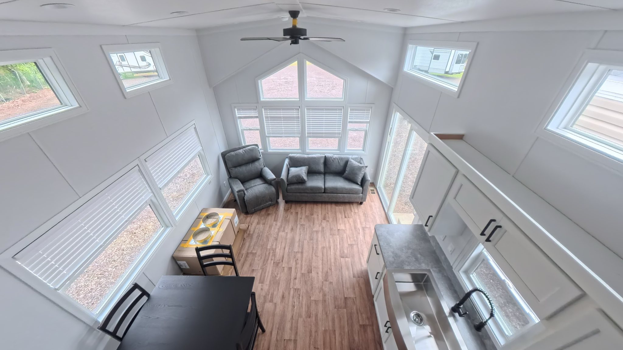 • Spacious living room with vaulted ceilings, large windows, ceiling fan, sofa bed, & recliner